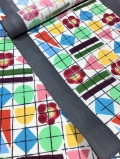 「ま~る♪さんかく♪しか~く♪♪」こんな歌が頭をめぐります☆絵本を見るかのような可愛らしいカラーリングが目に飛び込んできます。ワクワクするカラーで彩られた幾何学模様がパズルのように組み合わされたメルヘンチックな雰囲気を感じさせますが、その中に配された椿の赤とコチニールを鉄媒染して染色されたグレーの枠が子供っぽさを消し、大人の可愛らしさを演出するとともに和テイストにも仕上げられています。