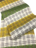 一見奇抜にも見える色鮮やかな黄色と緑の横段縞。しかし渋木で染められたはんなり優しい薄ベージュがクッション役となり見事に調和されバランスの取れた1つの作品に仕上がっています。