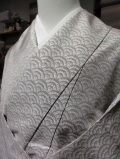 通常の大島紬は一反の反物の柄が全て同じ向きになっている為、前から見ると上向きでも後ろから見ると逆さになってしまうのですが、本品は青海波の模様が前も後も上向きになっています。