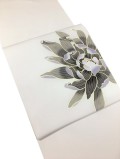 粋さの中に優しさを感じさせる色使いで大胆な花模様を上品に演出してくれる手挿し友禅染の九寸名古屋帯。着姿を美しく彩って見ませんか。