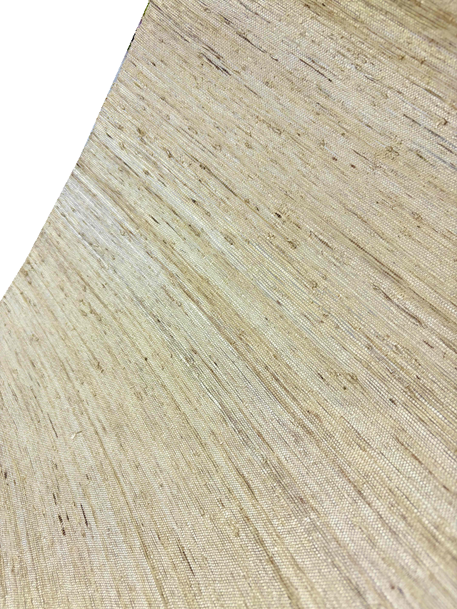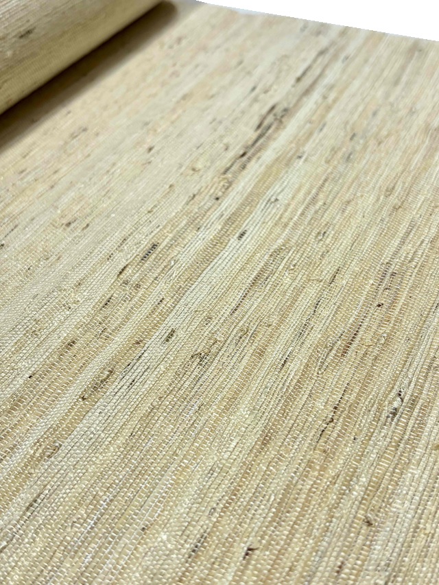 戦国時代から江戸時代まで 貴族の装束や武士の裃など様々な用途に使用されてきた葛布ですが 明治に入り 武士階級の消滅や貴族の洋装化により急激に需要が縮小してしまいました。ところが江戸時代から表装としても用いられていたことから襖地(ふすまじ)の製造にシフトしていくとともに葛布を染色し紙を裏打ちして壁紙として欧米へ輸出されるようになりました。「グラスクロス」として非常に人気を博し明治43年には年間12,600反(一反=36インチ8ヤード)の生産を記録したほどです。静岡県を中心に生産されていた葛布は 掛川周辺で原料を採取していましたが それでは追い付かずに栃木県や茨城県、福島県など各地で原料を作るようになりました。大正の中頃には朝鮮半島に出向いて葛苧(くずお=糸の前段階の繊維の状態)の作り方を教えて仕入れる業者も現れました。日中戦争や太平洋戦争により衰退するとともに 朝鮮からの葛苧の輸入も途絶えていましたが 静岡県、栃木県 茨城県 岐阜県などに葛苧の生産を委託し壁紙の生産が復活されました。