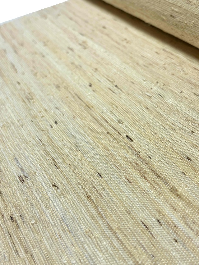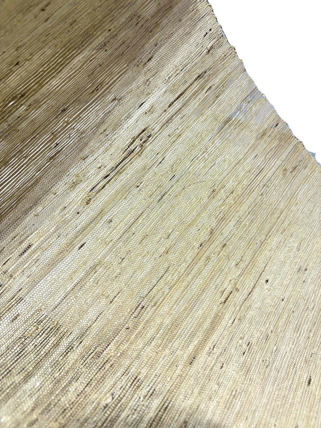 自然布には藤布やしな布 また芭蕉布などが有名ですが それらは縦糸 緯糸共にその糸を用いられていますが、大井川葛布は緯糸に葛糸をそして縦糸には絹や麻 木綿など他の天然繊維から作られた糸を用いるのが一般的です。(※本品の経糸は純国産絹から座繰された絹糸が用いられています)