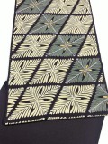 何とも言えない染の美しさに思わず溜息が出ませんか。引き染め技法によりボルドー色に地染された帯地に松葉を菱形に配した格調高い菱文様を海松色とクリームベージュに手染めされています。