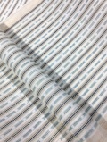 生成り地に藍染と草木染された苧麻で縞模様が配されたシンプルなデザインではありますが、微妙に変化する藍染の色が揺らぎという深みや味わいをかもし出し、絣の技法で表現されたブロック状の模様が豊かな表情を見せてくれます。
