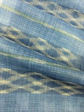 琉球藍で染め上げられた手績みの苧麻糸を手織りの技で織り上げられた宮古上布 九寸名古屋帯 琉球らしい絣模様の趣きと藍濃淡の横段 そしてさり気なく配されたグリーンの絣縞が奥行きや変化をもたらし これぞ作家の手仕事と思わず息をのんで見入ってしまう作品です。