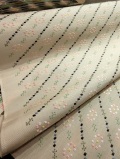ほんのりベージュがかった光沢のある帯地に、薄ピンク・イエローの優しいパステルの花織、その間には小さなグリーンの花織を並べた可憐で可愛い雰囲気に、ダークブラウン・グレー・モスグリーンといった渋めの色で斜めどりされた花織を配することで、知的で落ち着きのある大人の艶やかさをプラスし、上品で深みと可愛さを併せ持ち、さりげない色気をも感じさせてくれます。