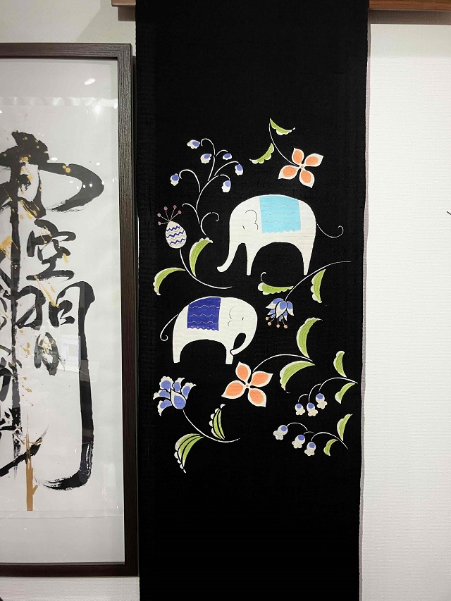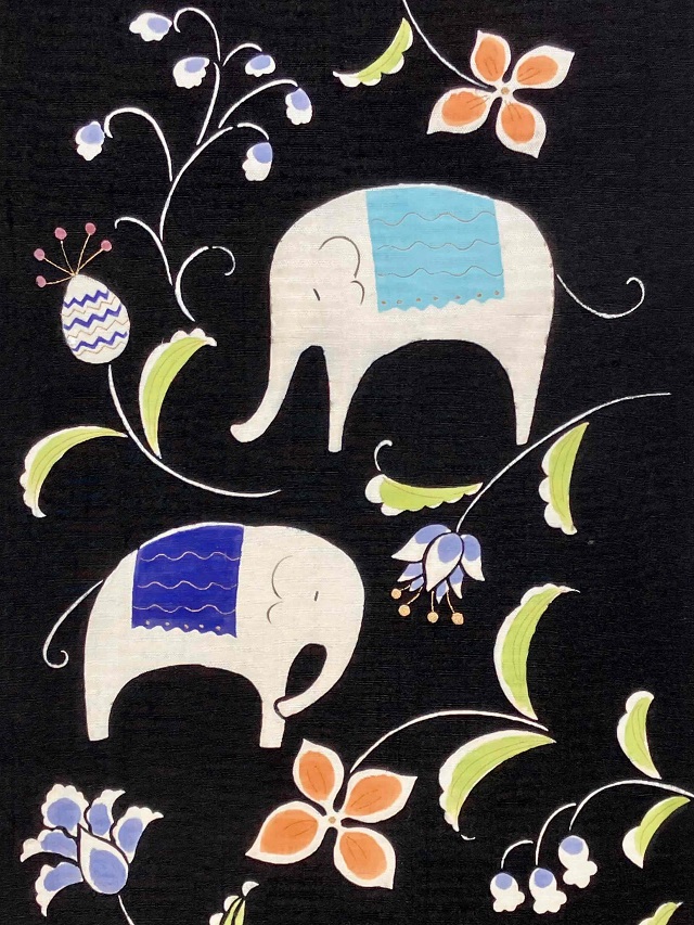 型絵染作家 岡田その子さん作「象と唐花」絵本の世界に足を踏み入れたかのようなメルヘンチックな作品です。思わずジーっと見つめてしまう程に優しく温かみのある作風に心癒されますね。