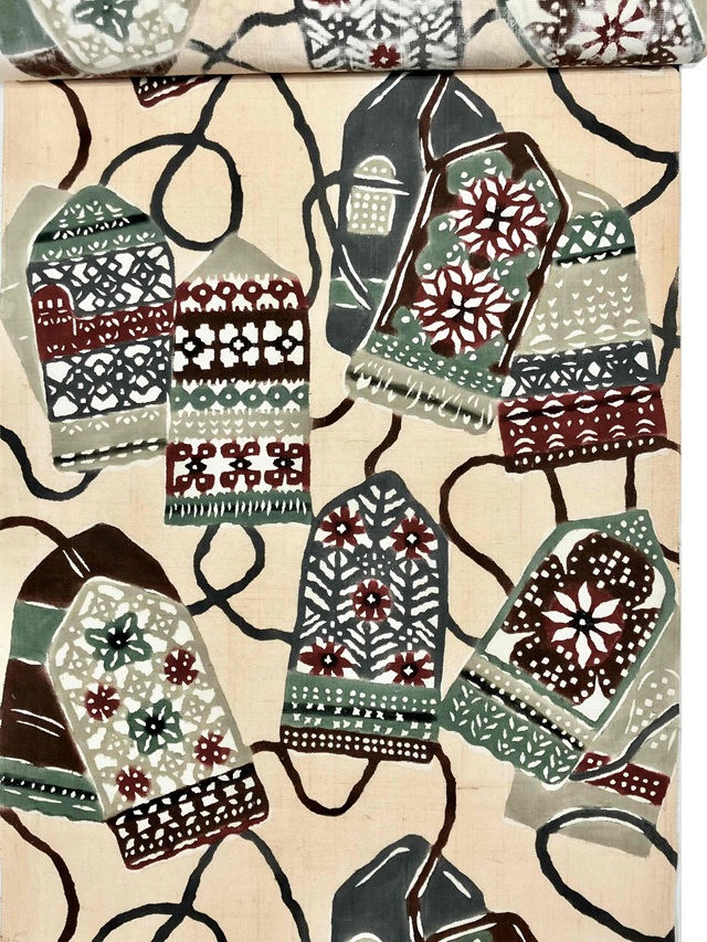 型絵染作家 小沢美由紀さんの作品「ミトン」。北欧のノルディック風デザインが施された毛糸のミトンを小沢美由紀さんの作品らしいナチュラル感覚の色調で表現されました。ミトンが和服のモチーフとして用いられているのを初めて目にしましたが、何故か温もりと同時に懐かしさが感じられるのが不思議です。洋と和の融合という上辺の表現ではなく「側に置きたい安心感」そんな魅力を感じる作品です。
