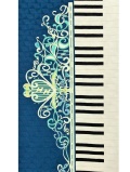 マリンブルーの地色が鮮やかで、ピアノの鍵盤に楽譜の記号を組み合わせたルネサンス様式建築やバロック様式建築を思わせる優雅なデザインが表現されています。