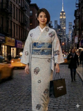 グレイッシュカラーの間に散りばめられたカラフルな松竹梅。朧型の効果によって、背景に染め上げられた草花の模様に浮かび上がる紅型染の鮮やかな色彩が印象的です。紅型染の着物はコーディネートしずらいとお考えの方も、総柄は派手だからと抵抗感をお持ちの方も、しっとりとした大人の着こなしがお楽しみ頂けます。