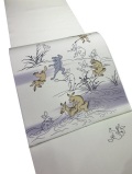 京都 高山寺に所蔵される、平安時代後期から鎌倉時代にかけて描かれた絵巻物 国宝「鳥獣人物戯画」をモチーフに染め上げられた”はんなり優しい”クリーム地に型糸目手挿し友禅染のお洒落で個性溢れる名古屋帯。