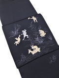 京都 高山寺に所蔵される、平安時代後期から鎌倉時代にかけて描かれた絵巻物 国宝「鳥獣人物戯画」をモチーフに染め上げられた粋な紺地に型糸目手挿し友禅染のお洒落九寸名古屋帯です。