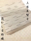 最後に・・上原さんは あけずば織のショールを製作されておりますが、今後はヨーロッパでの展覧会に向けての製作に入られるため 帯の製造を中断されます。その期間がどれくらいなのかは全く分かりませんが しばらくは新しい品は出来上がってこない為 商品の魅力は勿論ですが中断前に最後に出来上がってきた帯を仕入れてまいりましたことをお伝えしておきます。