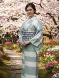 地機で織り上げられた本品は、真綿の空気をたっぷりと含みお召しになる方に優しく寄り添います。網代織と絣段模様が描くグリーンや藍色の陰影は静謐(せいひつ)でいてモダン。春には草木が芽吹くように、そして秋や冬には凛とした印象にと季節の移ろいに合わせて表情を変えて行きます。