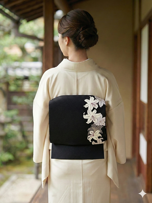 使用されている帯地は京都 丹後地方で製織されたシボ立ちの細かな縮緬生地で、しっとりとして しなやかな風合いが特徴です。