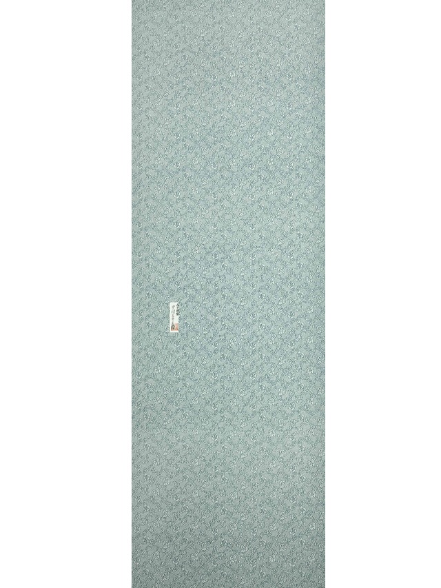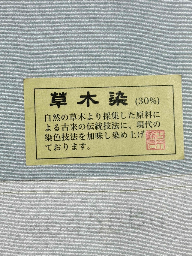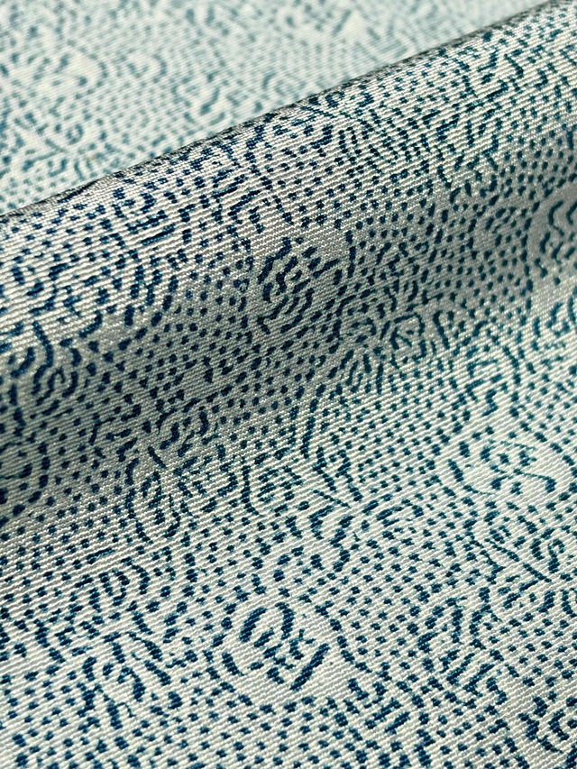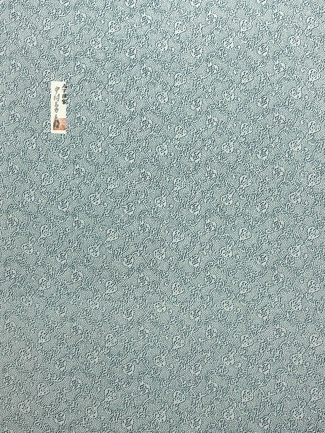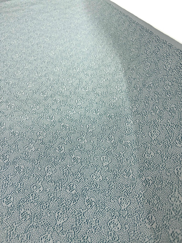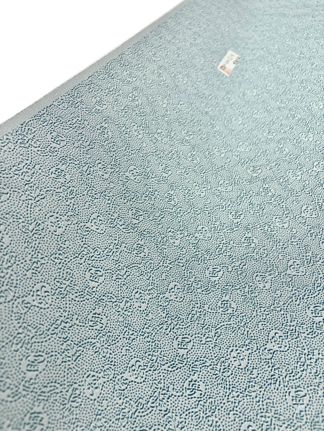 ※本品は、型の上からターコイズ色の色糊で糊伏せし、グレーの顔料で「しごき染」を施した後に、草木染と灰色がかった薄い水色の染料で引き染されています。