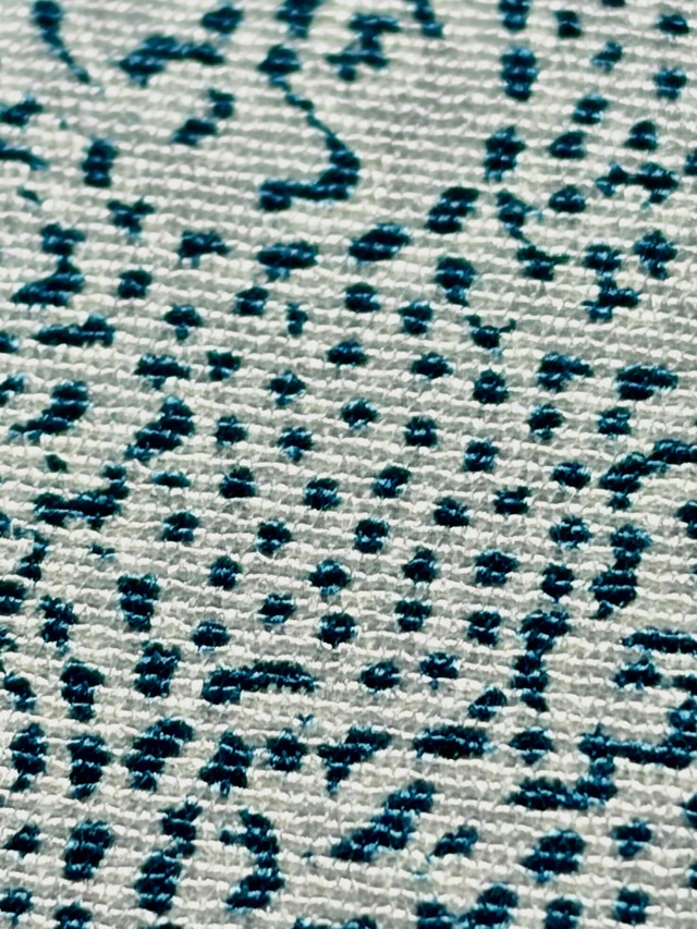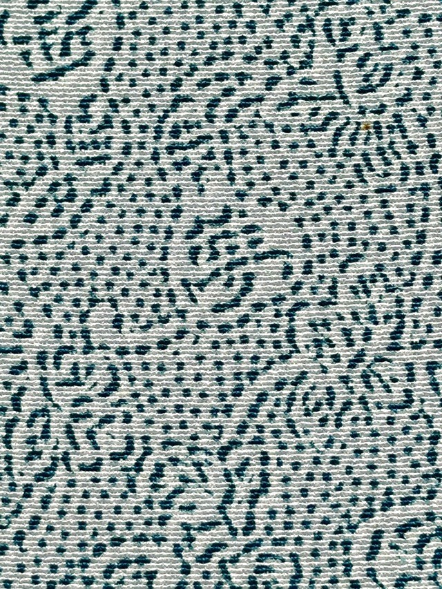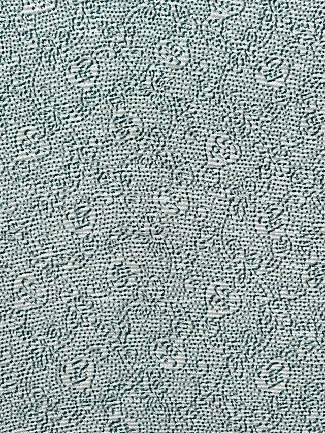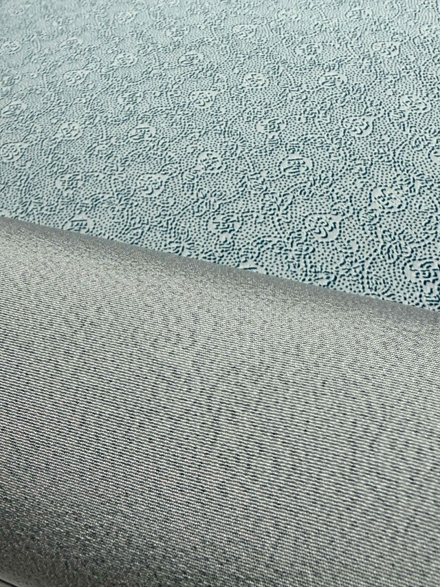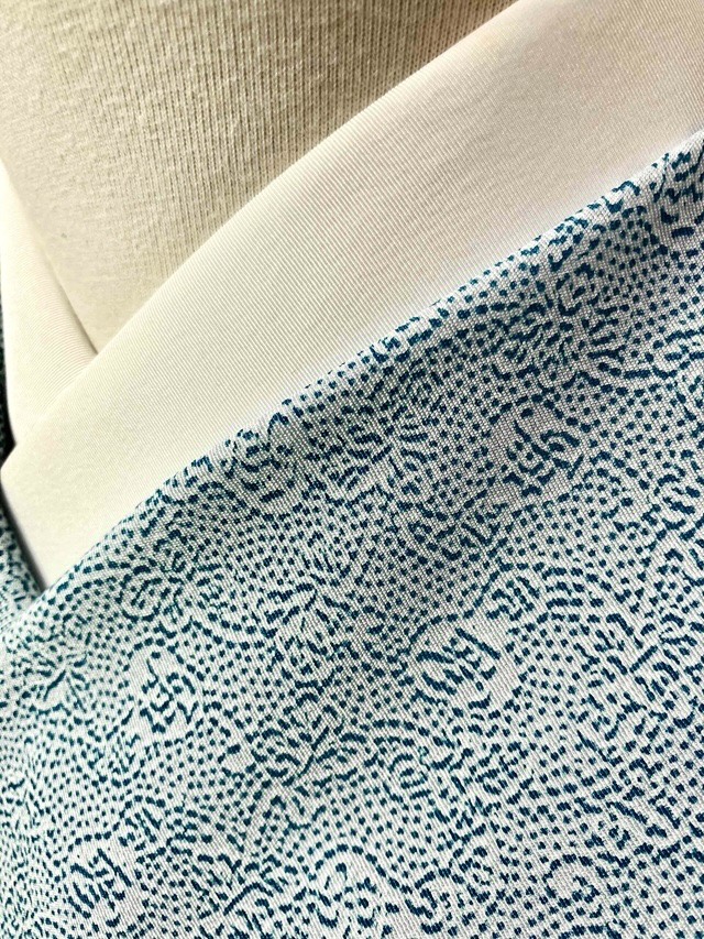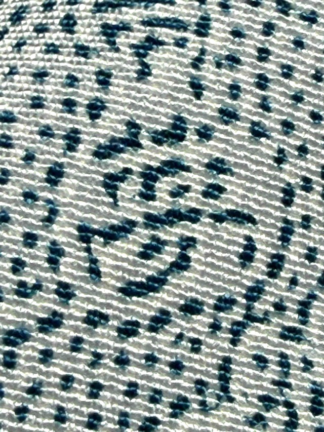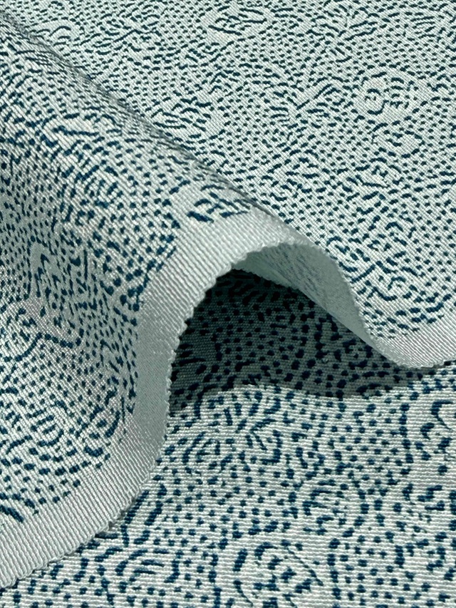 ※本品は、型の上からターコイズ色の色糊で糊伏せし、グレーの顔料で「しごき染」を施した後に、草木染と灰色がかった薄い水色の染料で引き染されています。