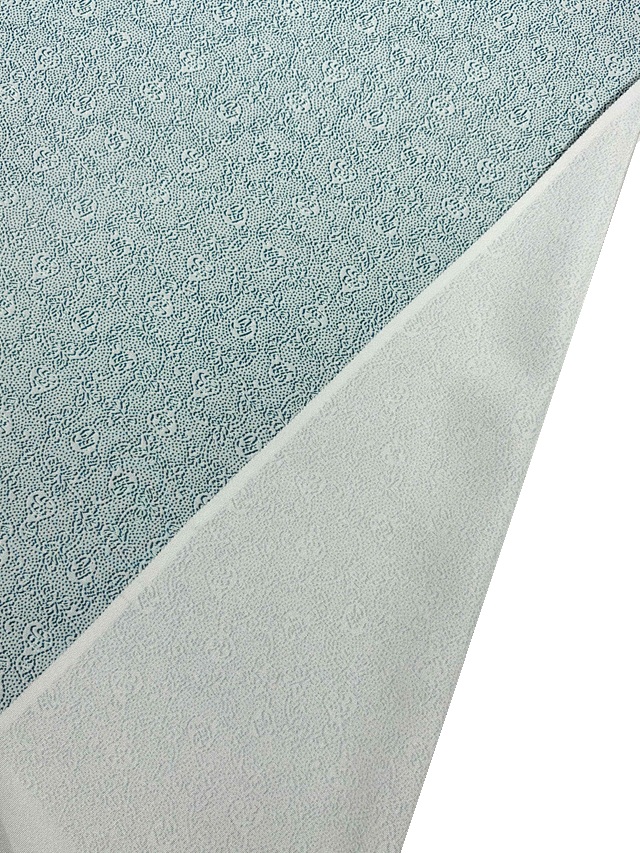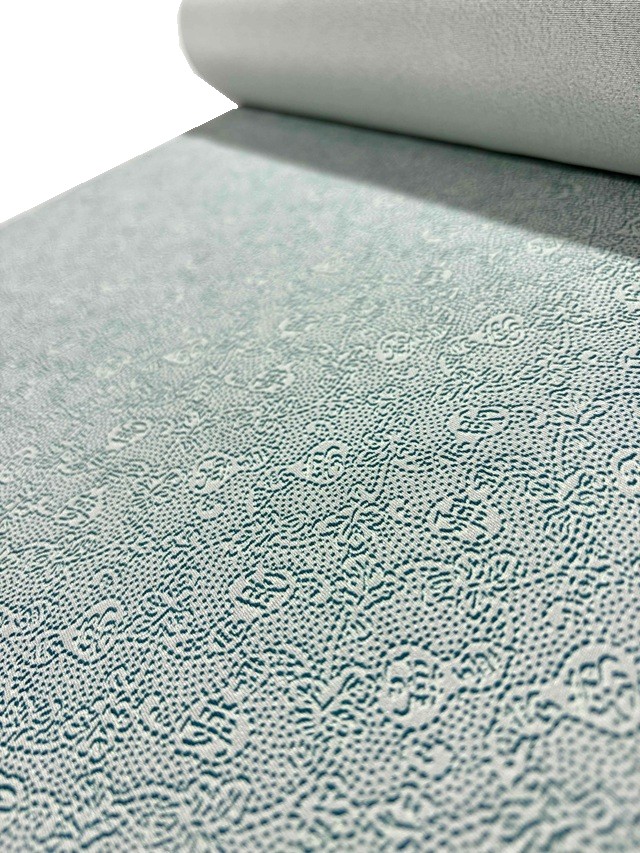 染め生地は滋賀県長浜市を産地とする高級素材 濱縮緬が用いられており、ドレープ性としっかりとした風合いを併せ持ち、伊勢型染の美しさを余すところなく伝えてくれますのでエレガントな着姿に仕上がります。