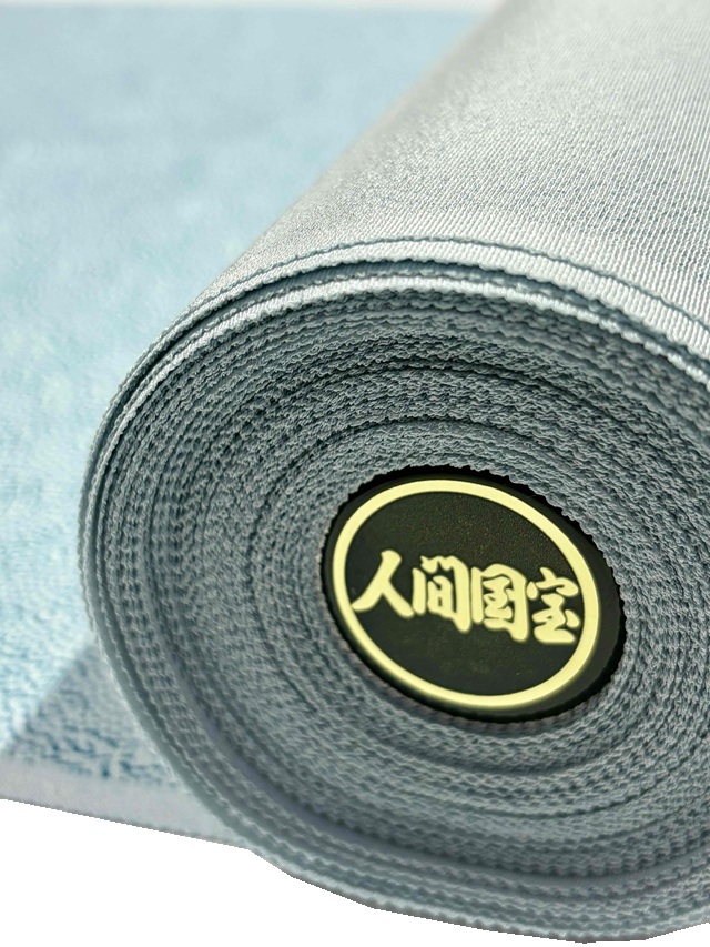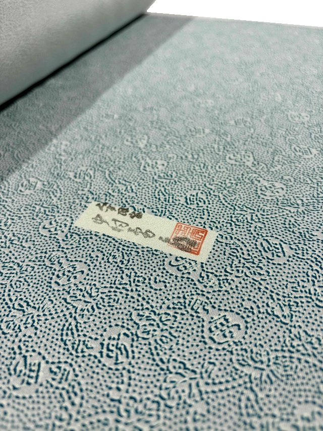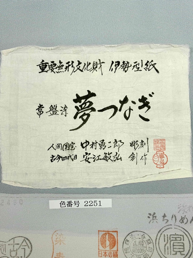 本作品「夢つなぎ」突彫りの重要無形文化財技術保持者人間国宝 故)中村勇二郎氏が彫り上げた伊勢型紙を用い、伊勢型専門染工房「染処古今(そめどころここん)四代目 安江敏弘氏」によって染め上げられました。