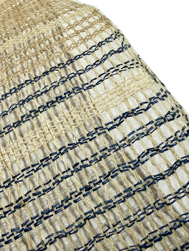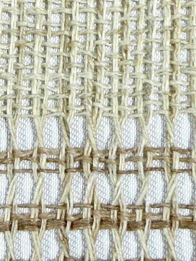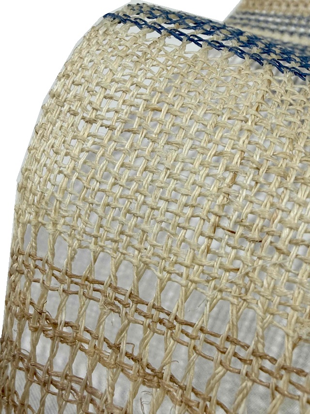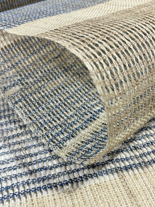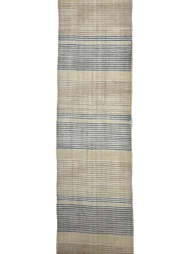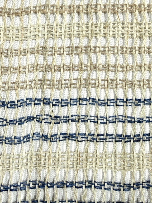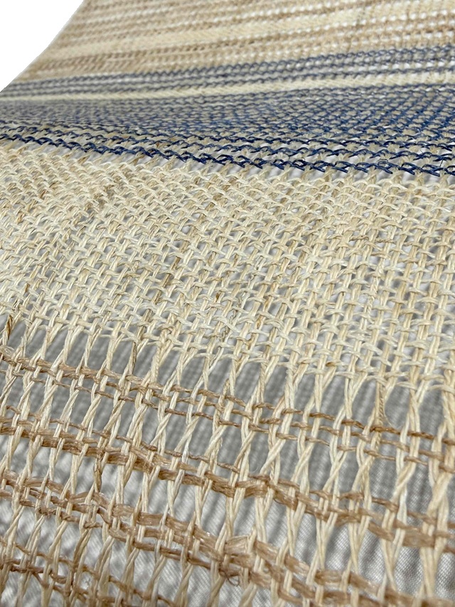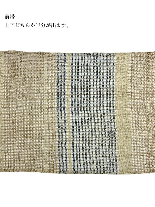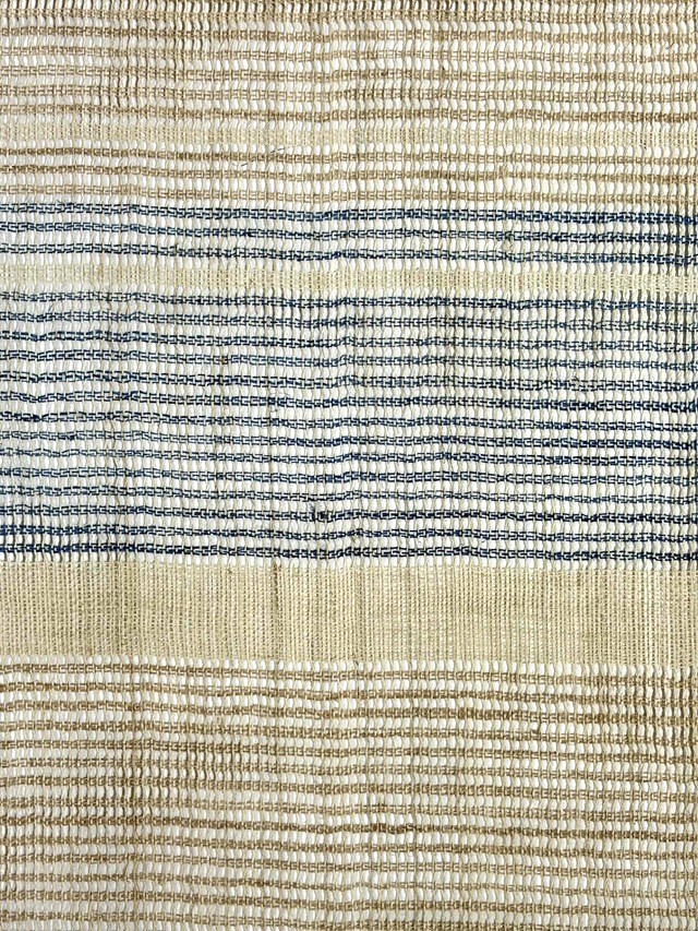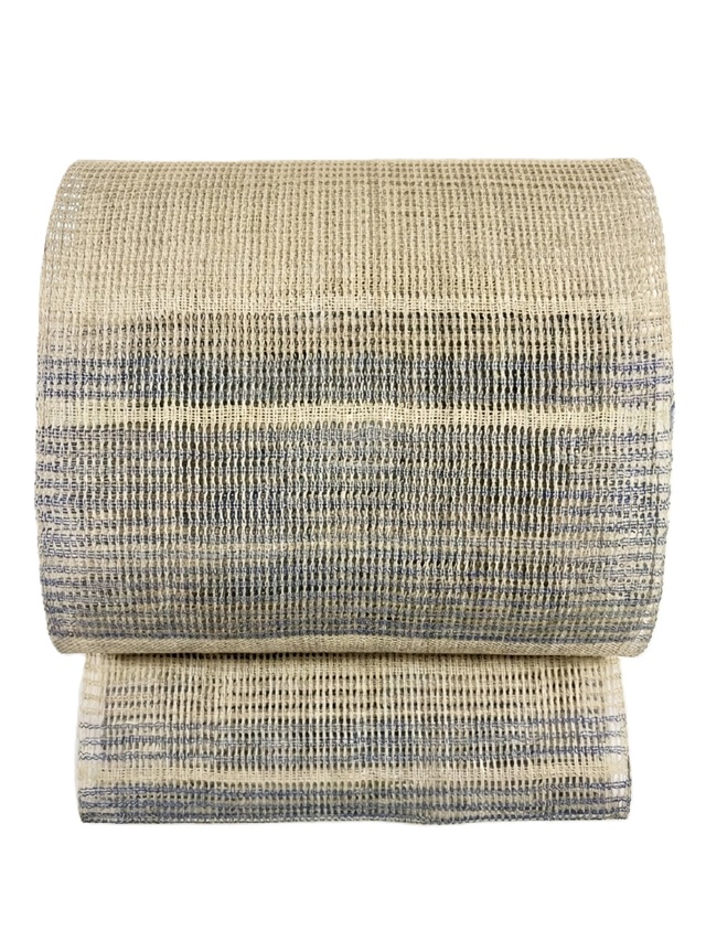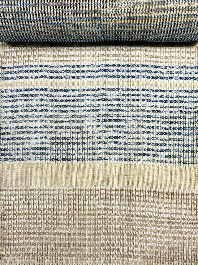夏の着物姿を趣深い印象に仕上げてくれる手織り麻羅織八寸名古屋帯。生成りにブルーの糸で表現された横段模様はシンプルさゆえに手仕事の魅力を引き立てます。羅織特有の隙間が風通しの良い涼やかさを感じさせ、麻糸のざっくりとした質感が工藝味豊かな着姿を演出してくれます。そして、捩り織の麻糸の重なりが立体的な奥行きを生み出し、表情豊かな面持ちを醸し出すのです。