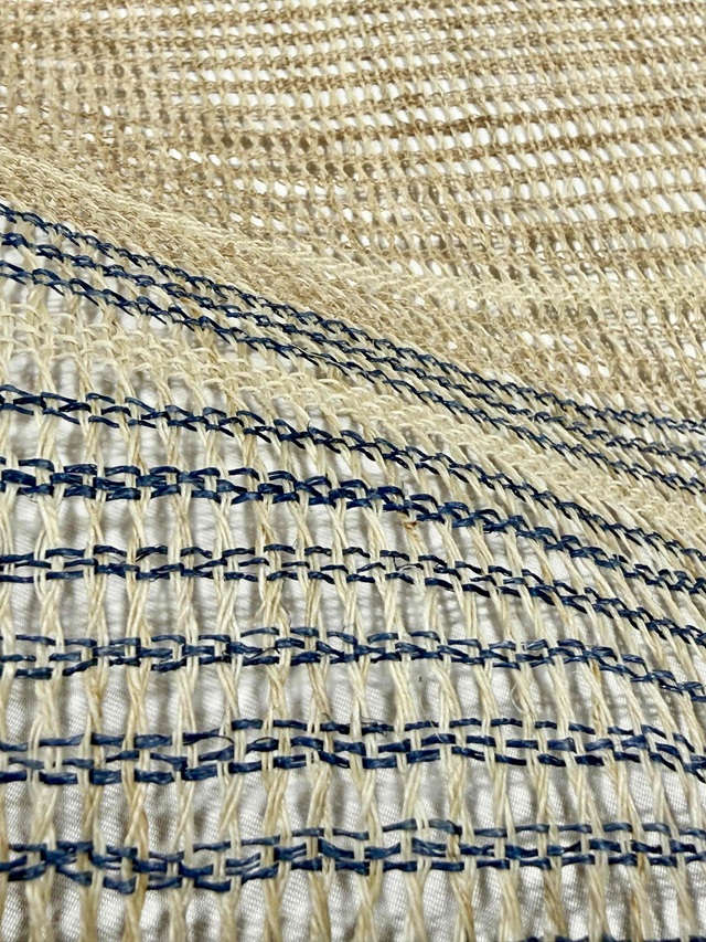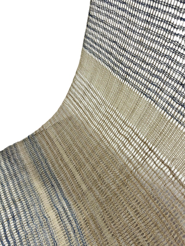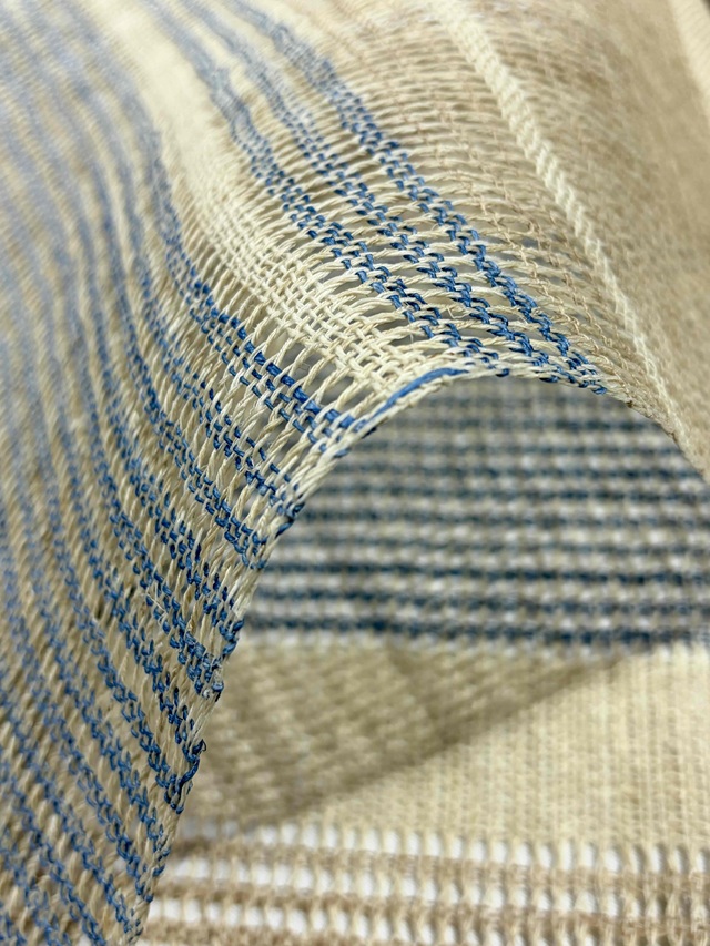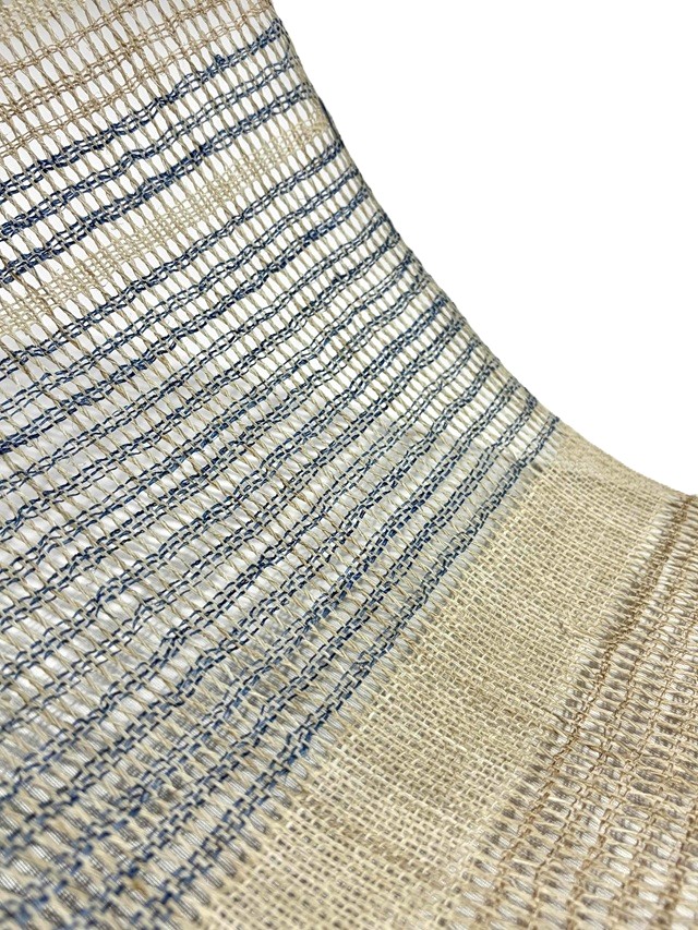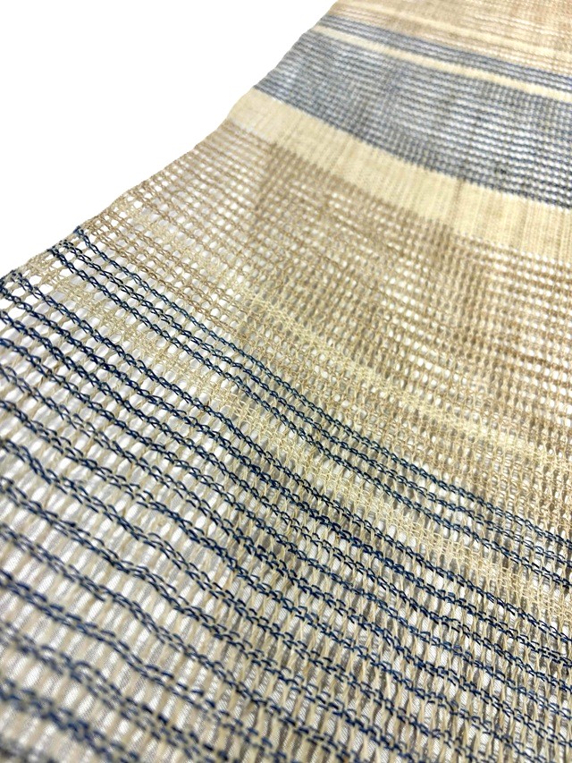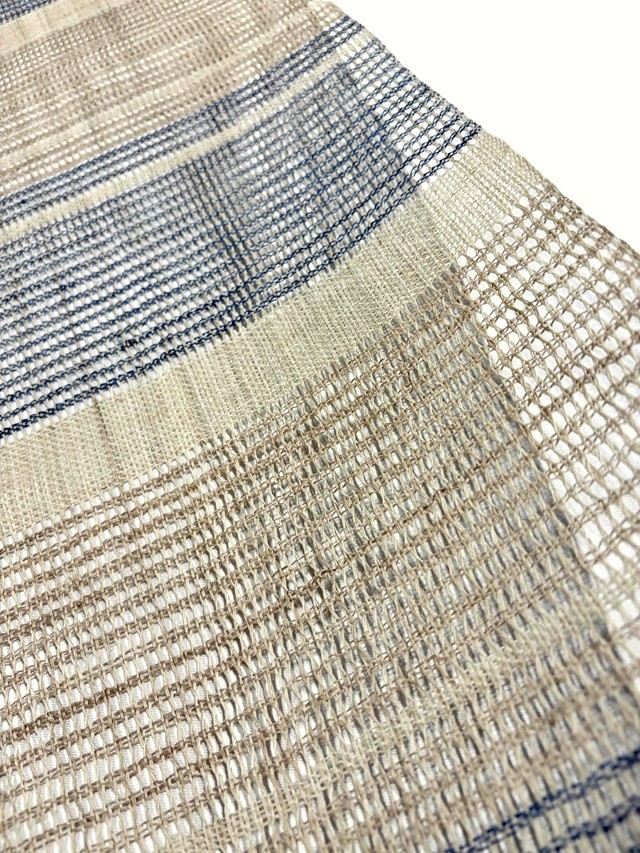 縦糸を捩って大きな隙間を開けて製織された羅織りが風を通すような透け感を生み出し、麻の冷ややかな手触りとザックリとした風合いは、夏の装いを豊かな清涼感と工芸味を漂わせます。