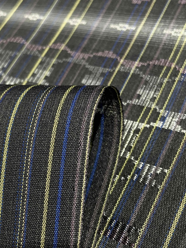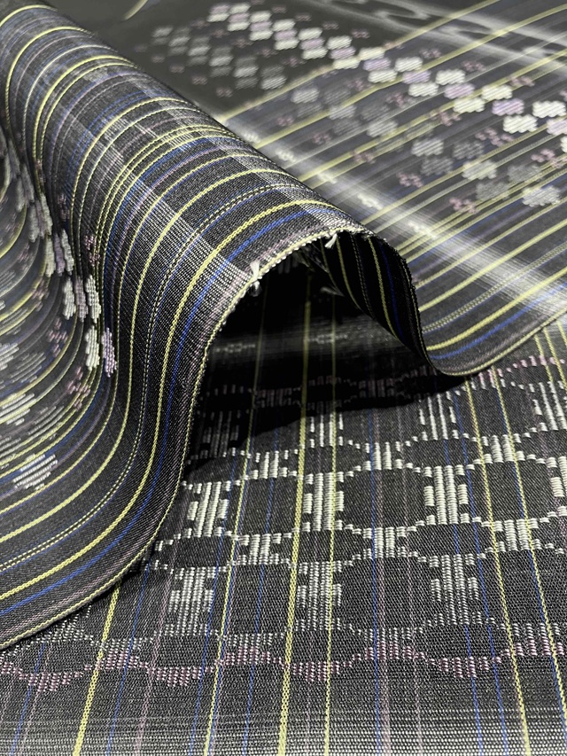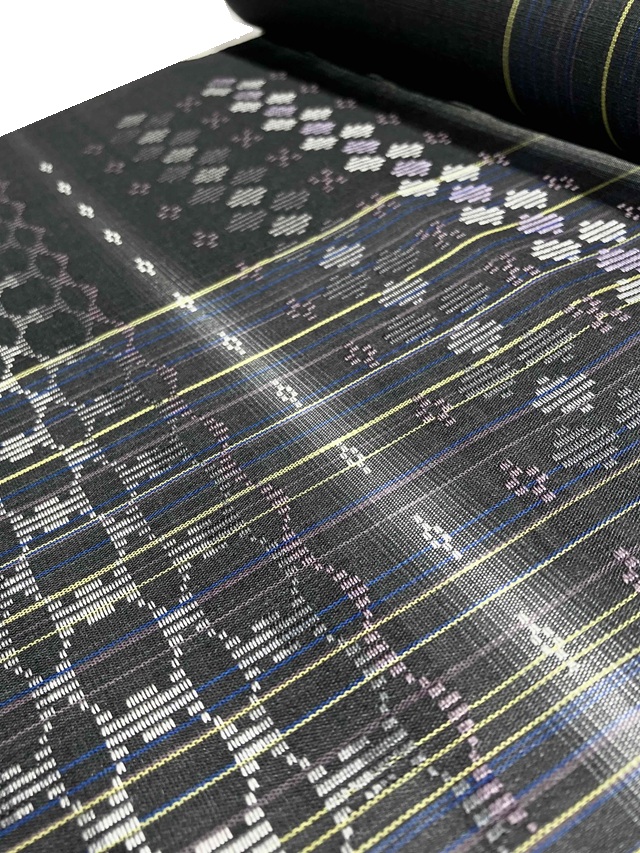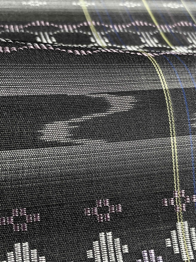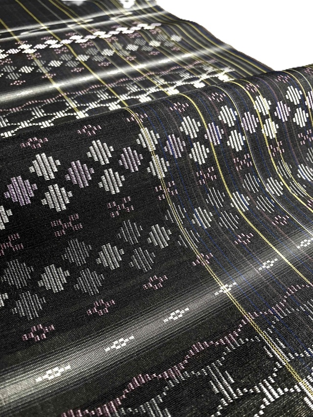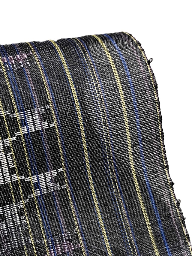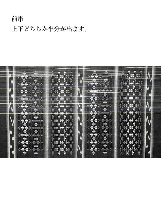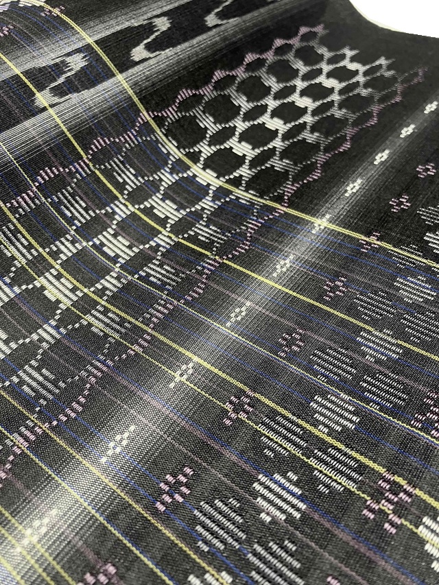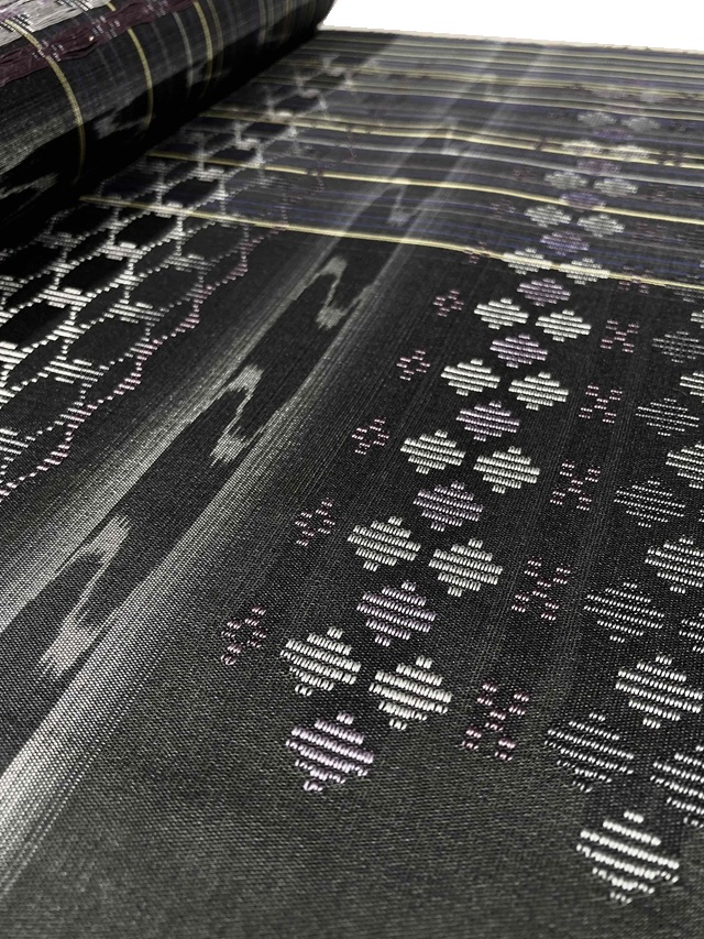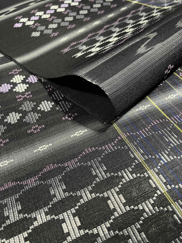 産地色豊かな沖縄の染織品、南風原花織九寸名古屋。単衣から夏の装いをハイセンスなデザインとカラーリングで彩ります。透け感のある夏生地が清涼感をもたらし、黒地にパープル・チャコール・シルバーのグラデーションで表現された花織模様がキラキラと輝く光の粒のような煌めきを放ちます。まるで幻想的な南国の夜空のような美しさは大人の魅力を引き立ててくれるのです。