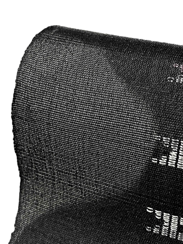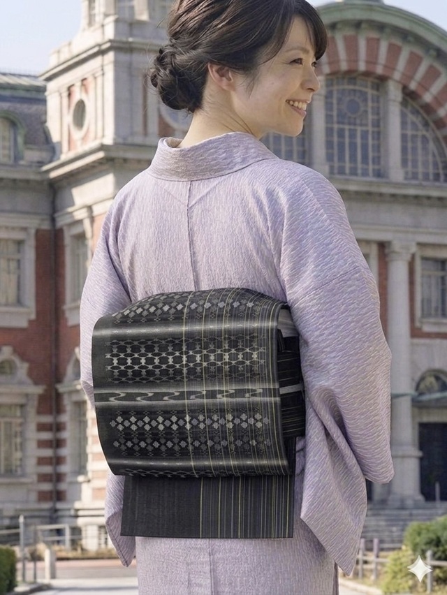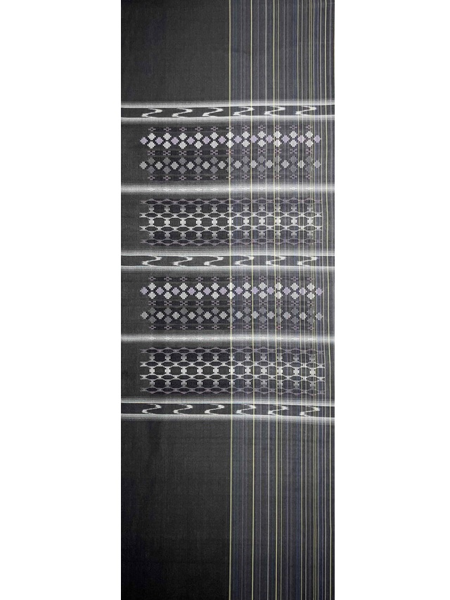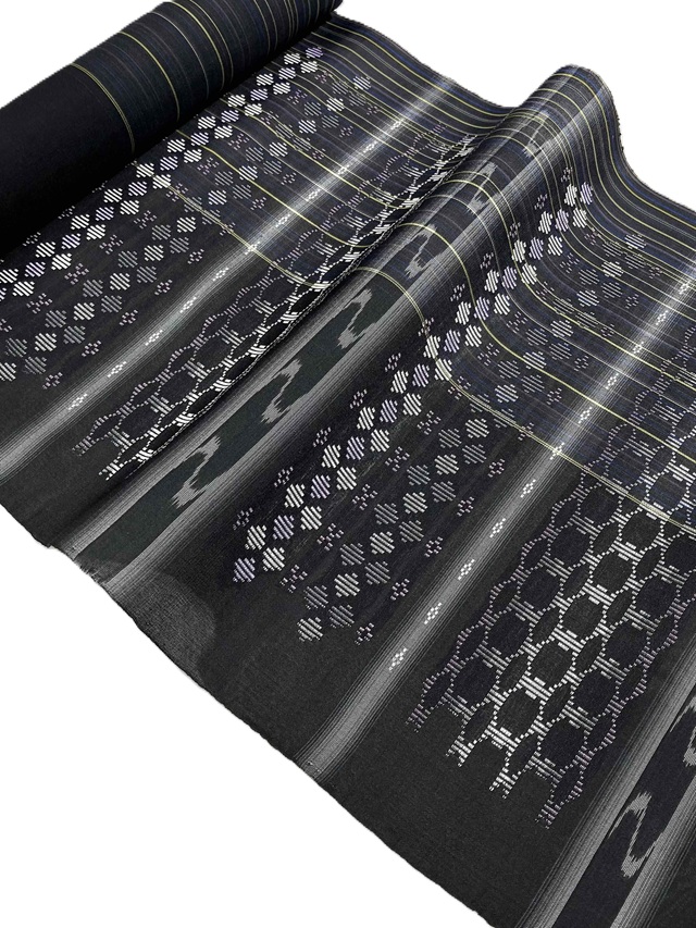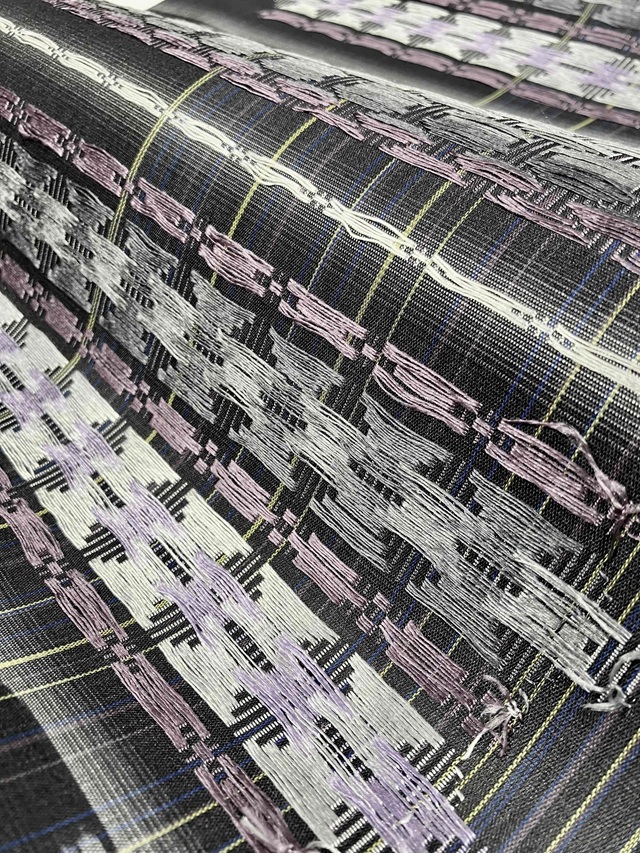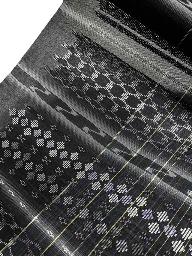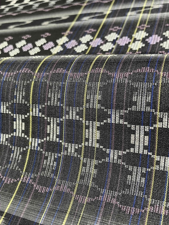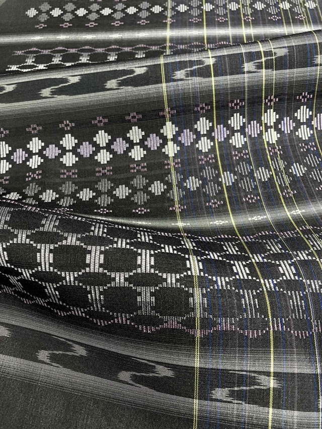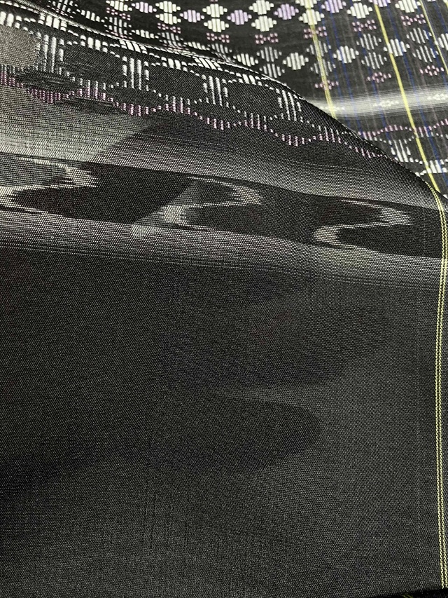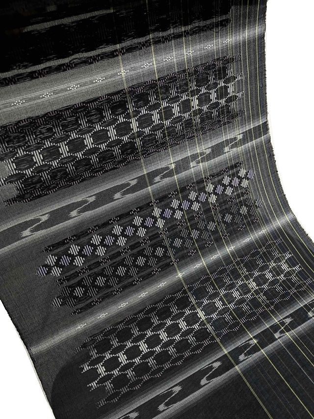 産地色豊かな沖縄の染織品、南風原花織九寸名古屋。単衣から夏の装いをハイセンスなデザインとカラーリングで彩ります。透け感のある夏生地が清涼感をもたらし、黒地にパープル・チャコール・シルバーのグラデーションで表現された花織模様がキラキラと輝く光の粒のような煌めきを放ちます。まるで幻想的な南国の夜空のような美しさは大人の魅力を引き立ててくれるのです。