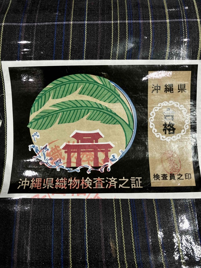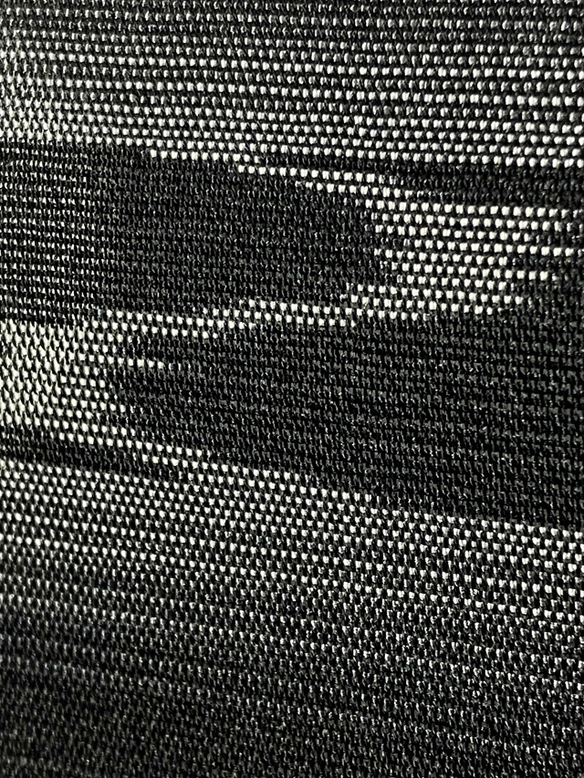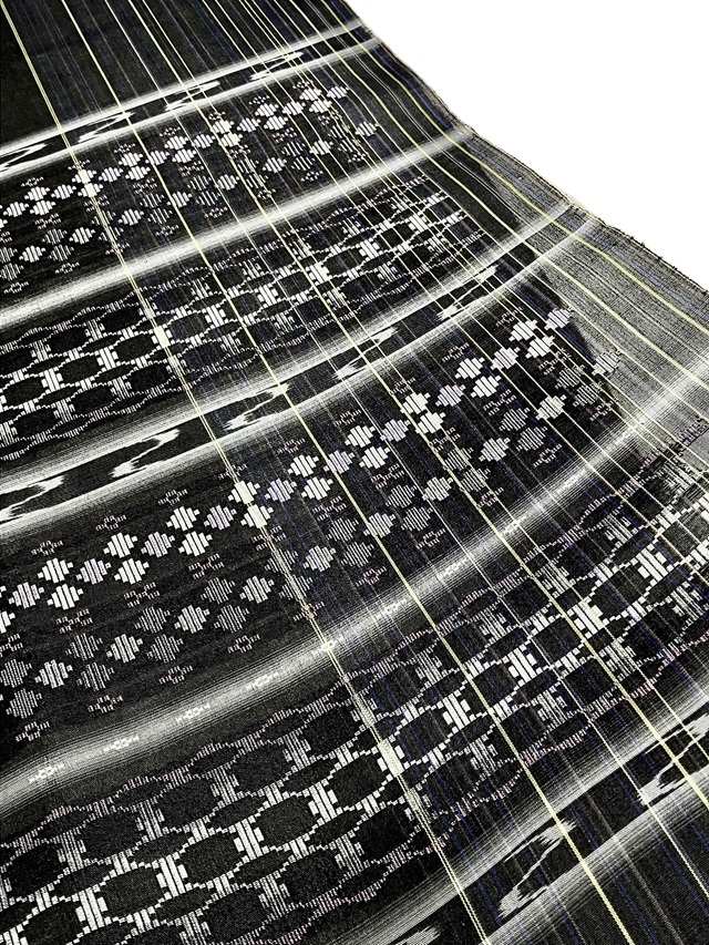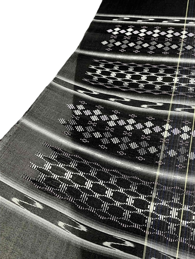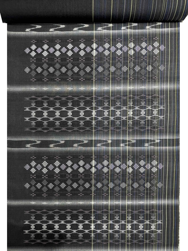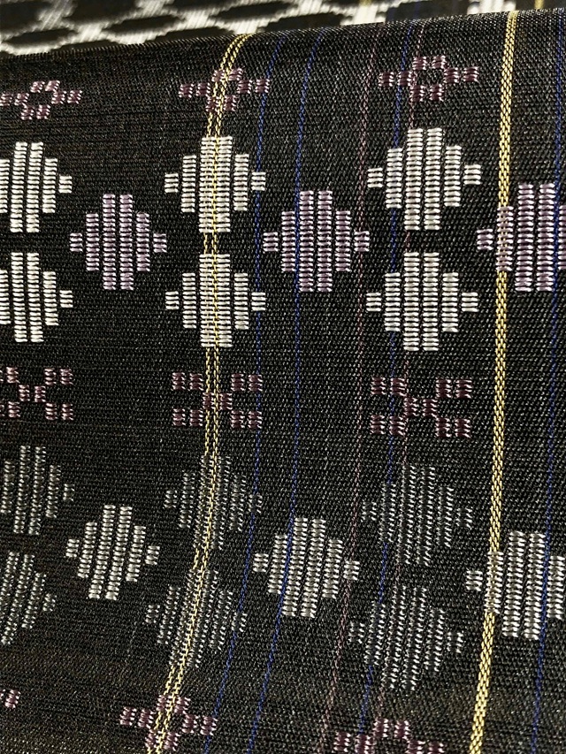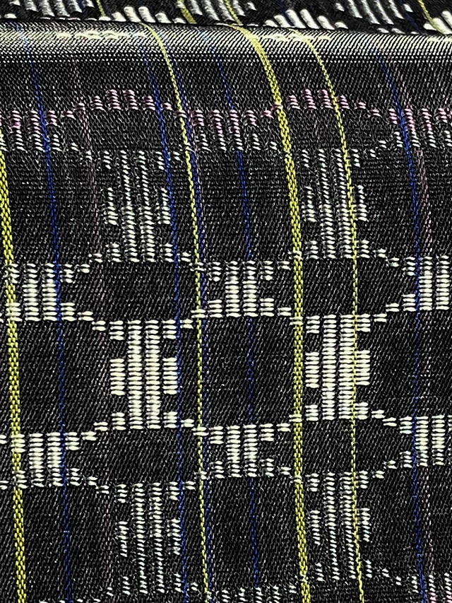 緯糸に織り込まれた柄糸を浮かせて織り出された幾何学模様の花織の間に水の流れを形どった絣模様が配されています。南風原町は琉球絣の産地としてもその名を轟かせており、野原織物工房さんは琉球絣の製造元でもあります。花織と絣を併用することでデザインが単調にならずに奥行が生まれ、伝統工芸の魅力が詰まった布に仕上がります。一人の職人さんが様々な手織り技法を習得する技術の高さゆえに素晴らしい作品が出来上がるのです。