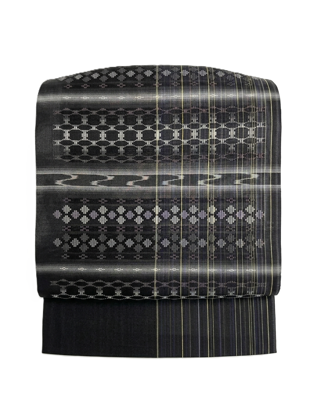 花織と絣の技術を併用して生み出されたお洒落な九寸名古屋帯が単衣から夏の帯周りをお洒落に彩ります。清涼感溢れる風合いと粋で幻想的なカラーリングがワンランク上の着姿を演出してくれます。生産数の減少と共に年々希少品になり価格も上昇しております。品質・デザイン・価格のどれをとっても自信を持ってお勧めさせて頂きますので、お目に留まりましたら是非お手元にお迎えくださいませ。