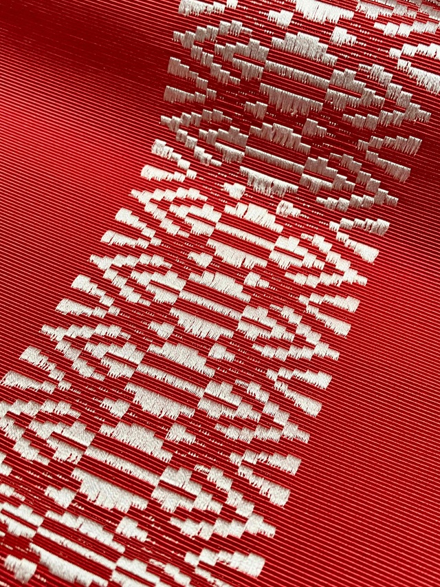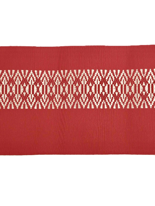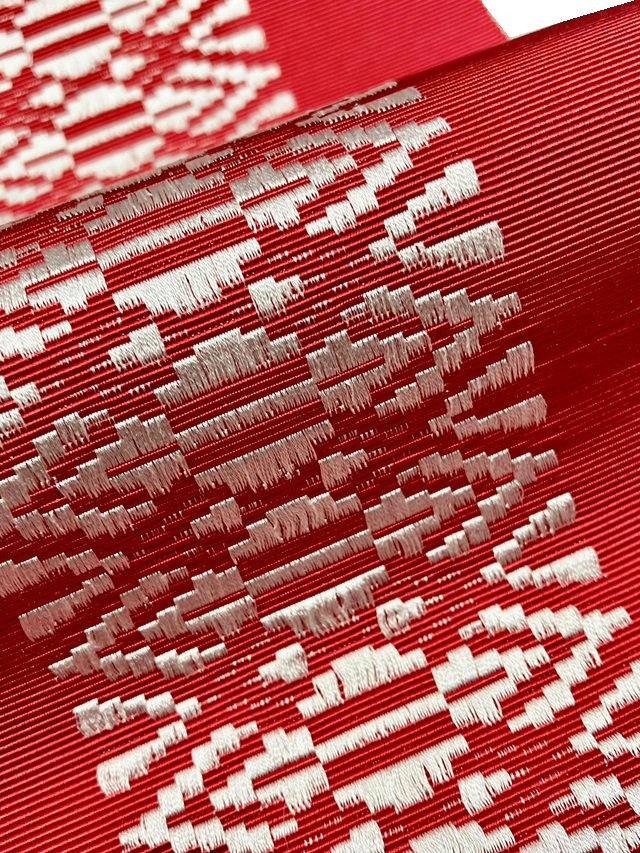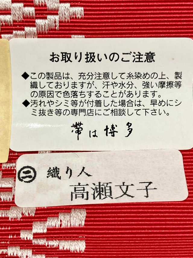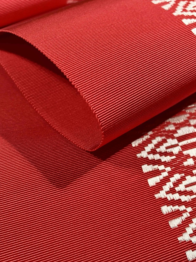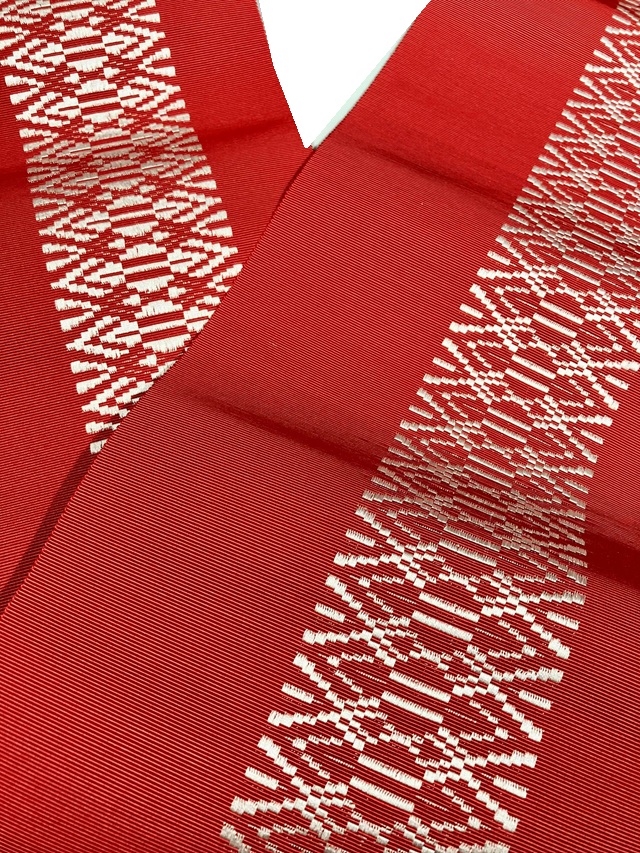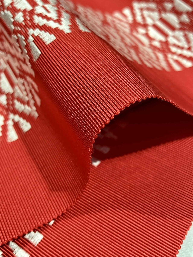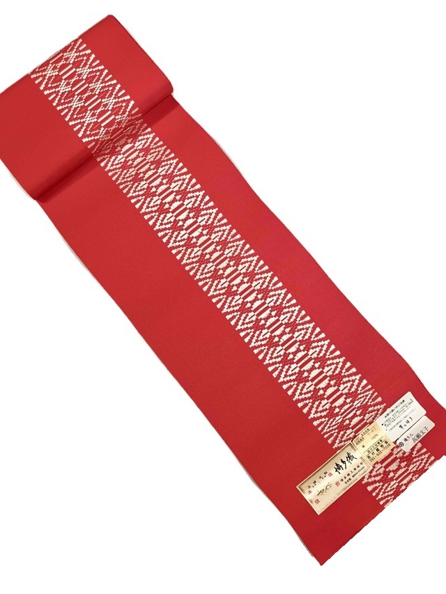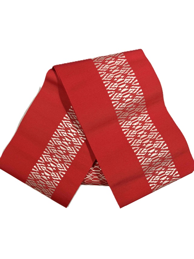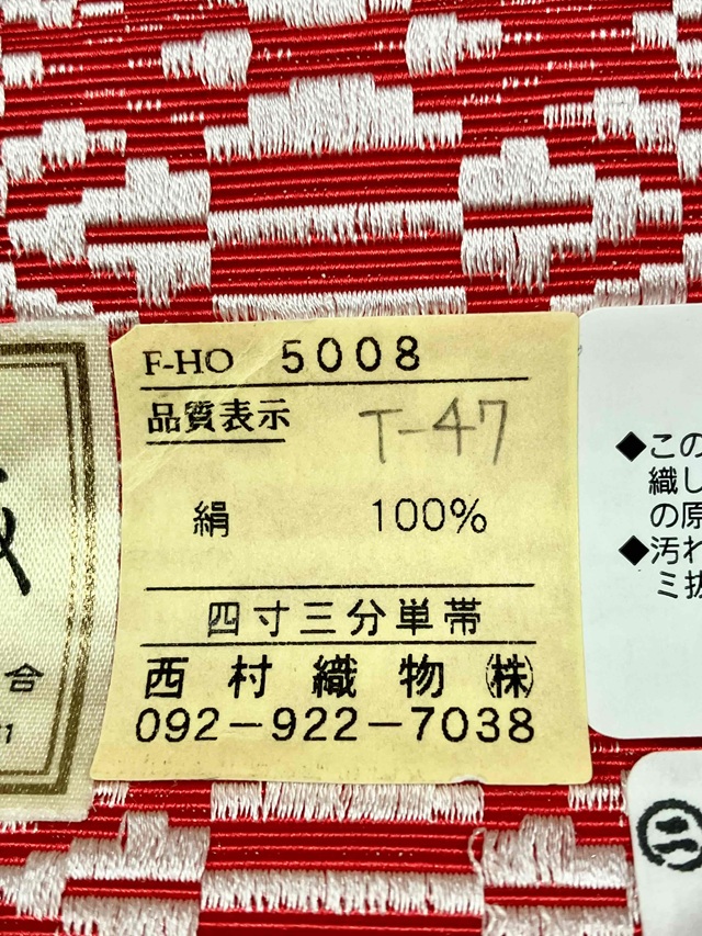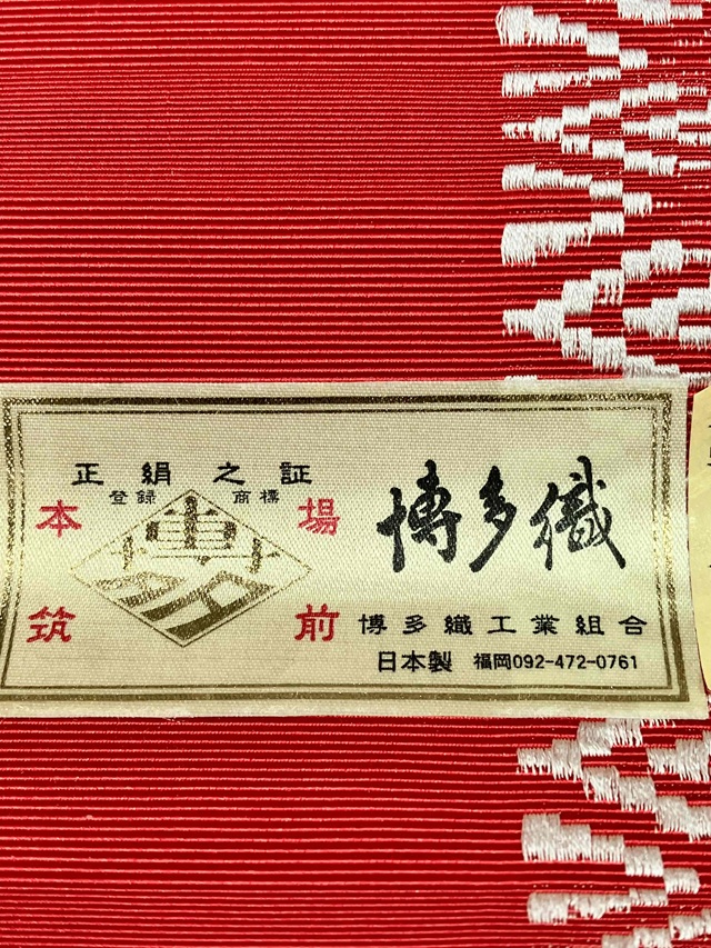 • 【本場筑前博多織】【四寸単衣帯】【浴衣帯】【半幅帯】【金印】【一本献上】【赤】【絹100%】【全通柄】【西村織物】【掘出し価格】【送料当店負担】【現品限り お値打ち価格】