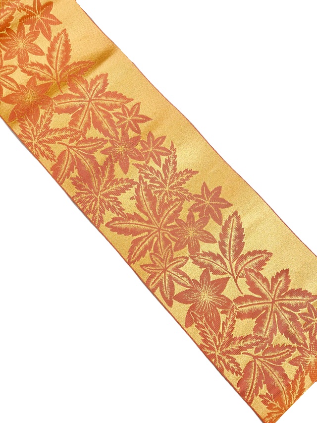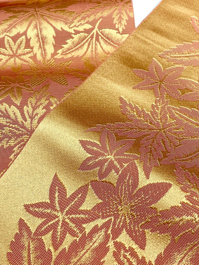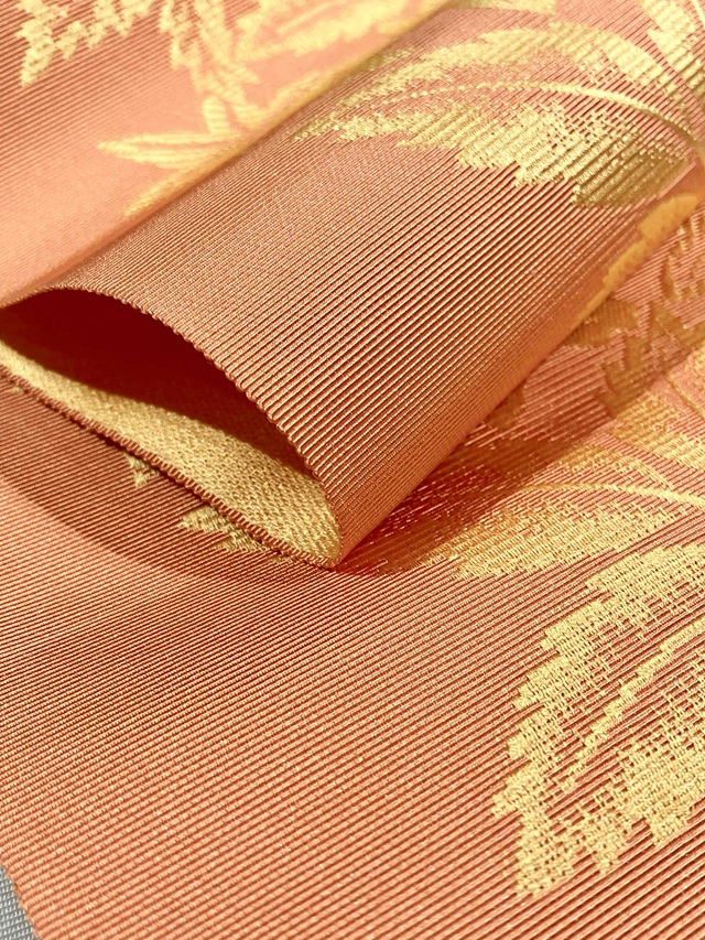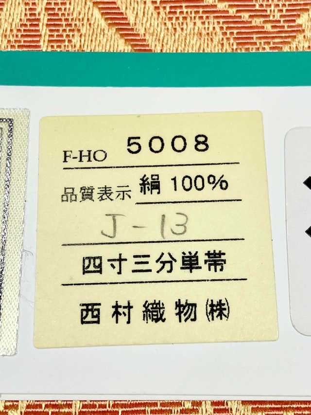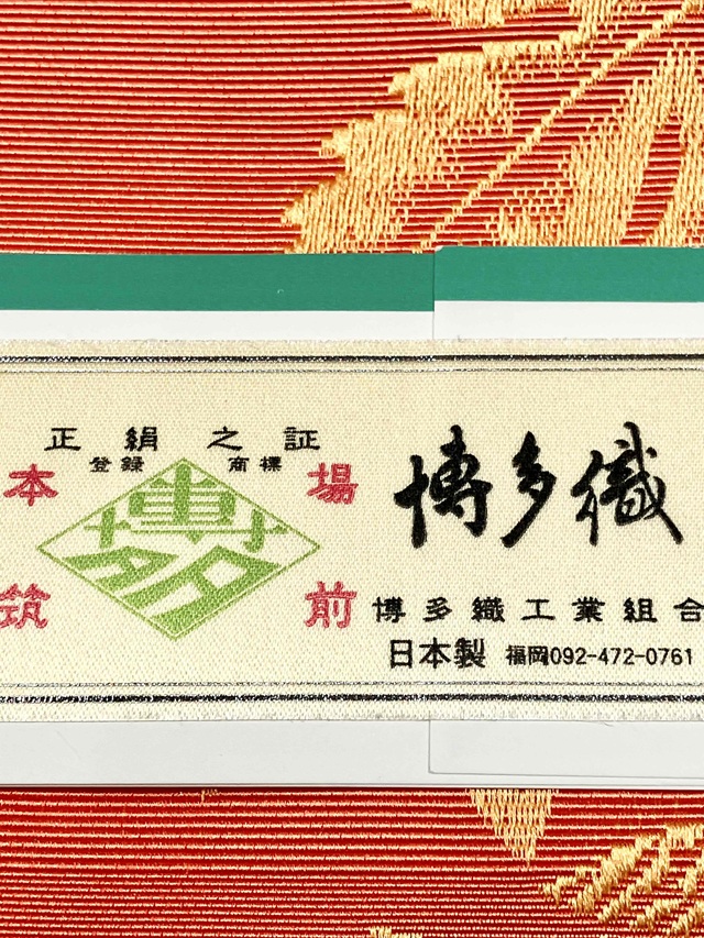 ※本品は緑の博多マークのお品です。絹100%ですが、縦糸は生糸に対して緯糸は絹紡糸が用いられています。2014年以降に証紙が改定されて絹100%の品は全て金マークに変更されましたが、本品は改定前に製造されたお品です。