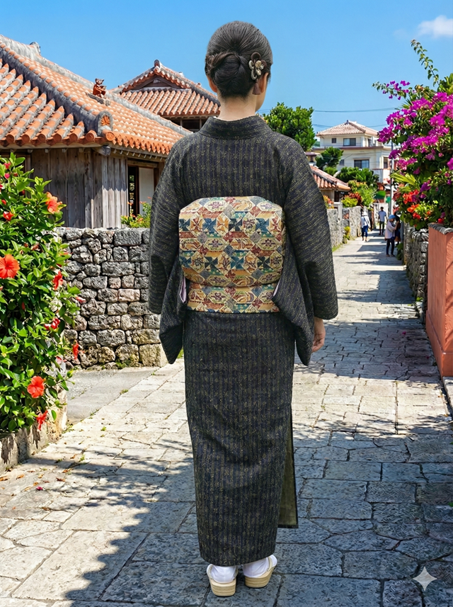 細かな柄行で色数の多い紅型帯ですのでコーディネートしずらいかな?とお考えの方向けに当店在庫とコーディネートしてみましたのでご覧下さい。実は合わせやすいですよ!