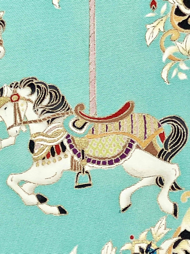 目に飛び込むミントブルーに目を奪われます。ヨーロッパ調のクラシックな木馬が懐かしくノスタルジックなメルヘンの世界に誘いでくれるのです。手描き友禅による細部にまで行き届いた繊細な輪郭線と彩色の美しさ、木馬のリアリティさがメリーゴーランドというモチーフに子供っぽさを一切感じさせず大人の女性にこそ相応しい作品に仕上がっています。京友禅の名門として多くの着物愛好家や専門店筋から高い人気と支持を得る成謙工房が生み出す逸品が着姿を彩ります。