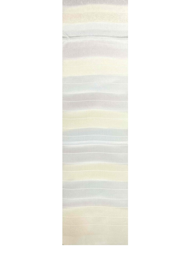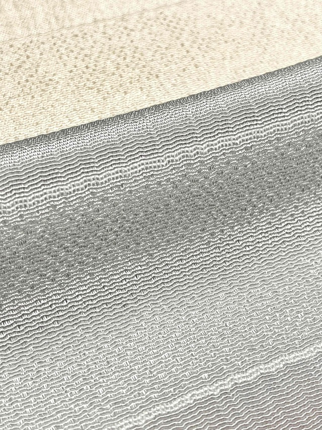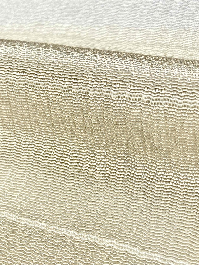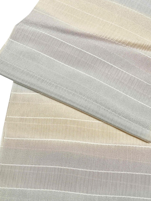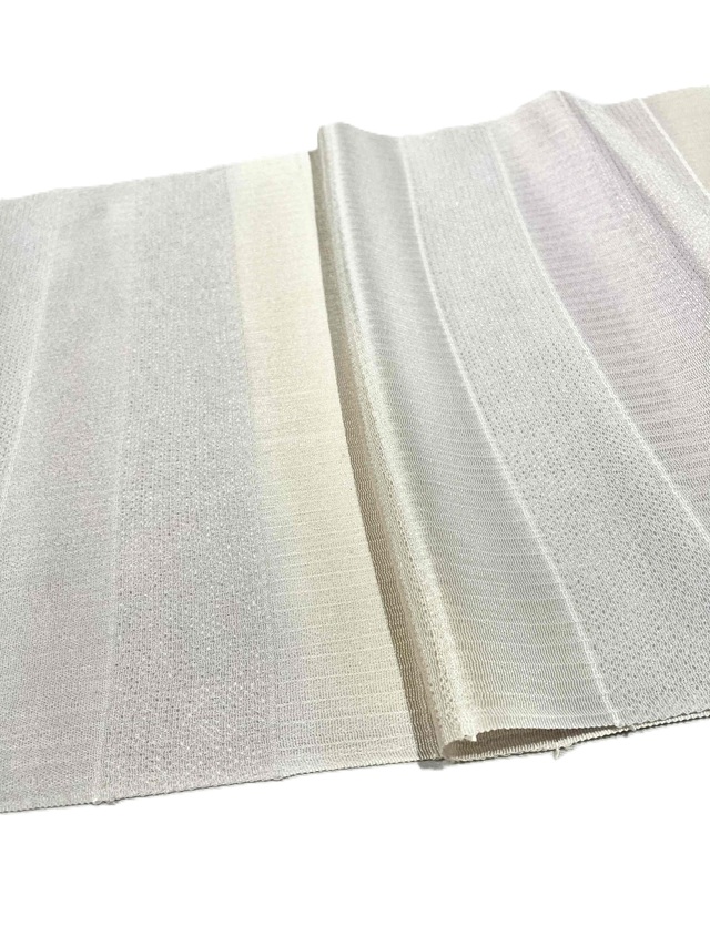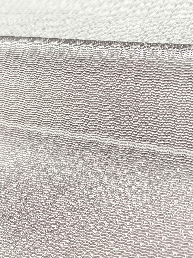 しっかりとしたシボが立った部分と、ストライプの地模様に織り分けされた段模様の生地は、軽やかでしっとりとした風合いに仕上げられており、手染めされた上品な色彩が高級感のある帯周りを演出してくれます。