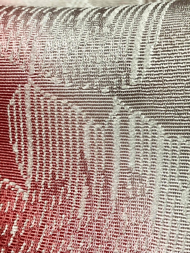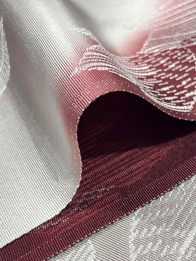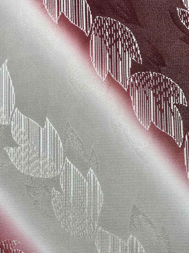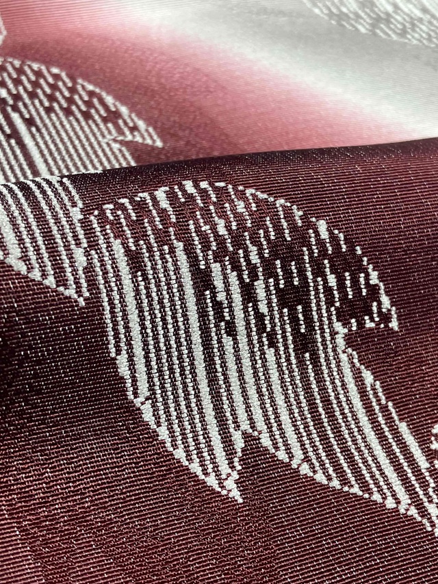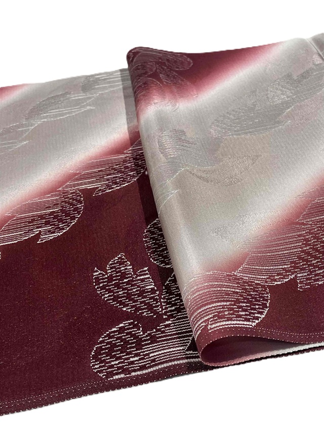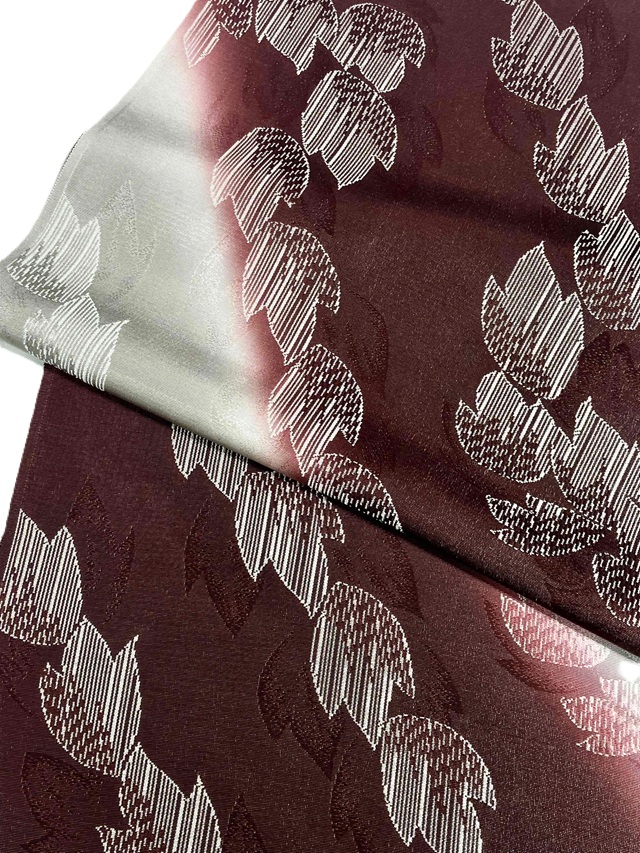 手染めによって斜め暈しに染め上げられた美しい光沢感。葉っぱを織り出した糸は染色しても染まらない特殊な糸が用いられており、浮かび上がるような立体感が帯周りをお洒落に仕上げてくれます。