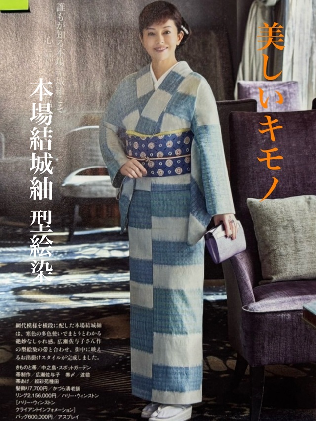 国の重要無形文化財技術に指定される「本場結城紬 地機」織り手と地機が一体となって織り上げられる手紡ぎ真綿の織物は、空気をたっぷりと含んだ柔らかさと温もりが感じられお召しになるほどに肌に馴染み徐々に熟成されていきます。季節の移ろいに合わせて表情を変える意匠と袖を通すたびに自身の一部へと育っていく一生モノの手仕事の結晶をご堪能下さい。美しいキモノに沢口靖子さん着用で掲載されたお品ですのでより一層の特別感を感じていただけます。